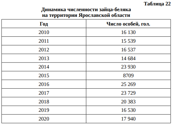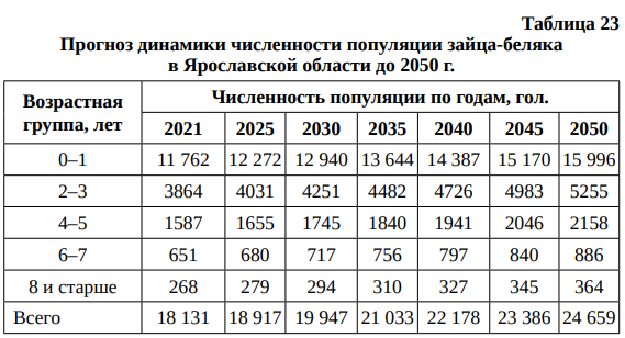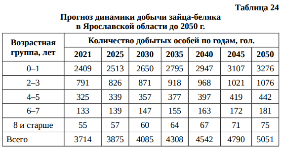 Прогноз динамики добычи зайца-беляка в Ярославской области до 2050 г. представлен в табл. 24.