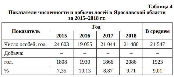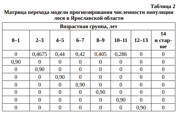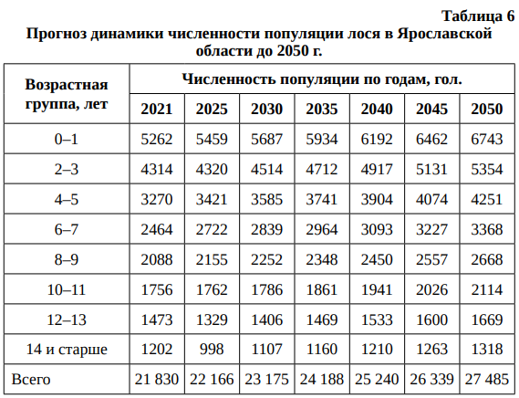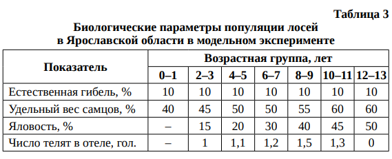 При прогнозировании численности популяции лося в Ярославской области был скорректирован процент естественной гибели лося (увеличен на 2 %) с учетом сокращения кормовой базы из-за хозяйственной деятельности человека и ухудшения экологических факторов (табл. 6).