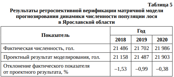 Результаты ретроспективной верификации матричной модели прогнозирования численности популяции лося в Ярославской области отражены в табл. 5.
