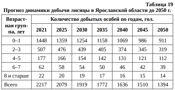 Прогноз динамики добычи лисицы в Ярославской области до 2050 г. представлен в табл. 19.