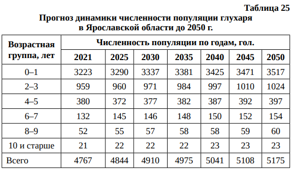 Прогноз динамики численности популяции глухаря в Ярославской области до 2050 г. представлен в табл. 25.