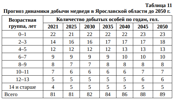 Прогноз динамики добычи медведя в Ярославской области до 2050 г. (при уровне добычи 5,5 %) представлен в табл. 11.