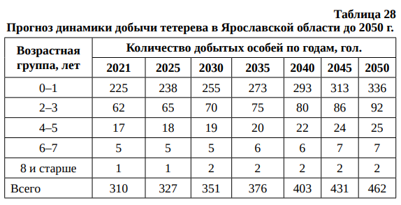 Прогноз динамики добычи тетерева в Ярославской области до 2050 г. приведен в табл. 28.