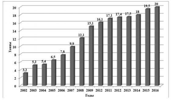 Рис. 3. Темпы роста товарной аквакультуры в период с 2002 по 2016 гг.