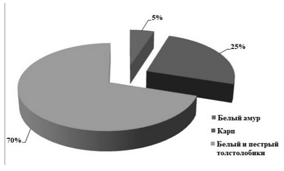 Основной объём товарной продукции предприятий аквакультуры Астраханской области представлен карповыми и растительноядными видами рыб, такими как карп, белый и пестрый толстолобик, белый амур [7]. Выращивание их в процентном отношении отражено на рисунке 2.