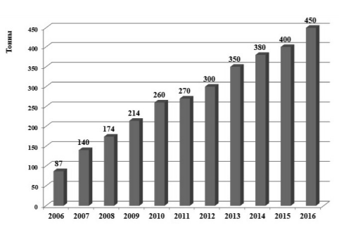 Рис. 1. Темпы роста товарного осетроводства в Астраханской области в период с 2006 по 2016 гг. (по данным Агентства по рыболовству Астраханской области)