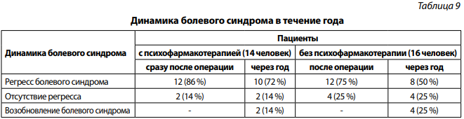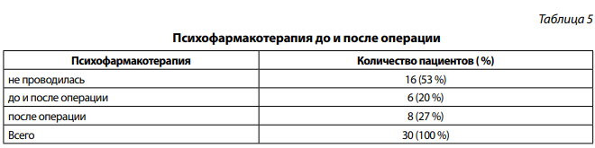 Из 12 пациентов, продолжавших получать противосудорожную терапию, у 50% (6 пациентов) отмечался регресс болевого синдрома. Продолжение приема терапии было обусловлено лишь опасением его возобновления. 14 пациентов в предоперационном периоде принимали различные психофармалогические препараты (табл. 4).