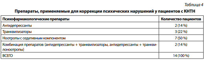 У пациентов с КНТН и психическими нарушениями выделено четыре основных психопатологических синдрома: а) тревожно-депрессивный, б) астено-депрессивный, в) астено-ипохондрический и г) обсессивно-фобический. Степень выраженности того или иного синдрома претерпевала некоторые изменения в процессе течения основного заболевания, а также зависела от проводимой психофармакотерапии.