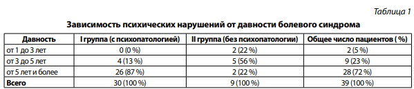 Вероятность возникновения психических нарушений увеличивалась прямо пропорционально длительности болевого синдрома. При длительности болевого синдрома более 5 лет 77% пациентов имели психические нарушения (табл. 1).