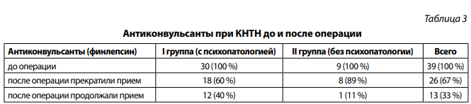 Противосудорожные препараты карбамазепинового ряда в качестве анальгетика принимали все 39 пациентов. В послеоперационном периоде из I группы (с психическими нарушениями) 60 % пациентов (18 человек) прекратили прием препаратов, а 40 % (12 человек) продолжили принимать финлепсин. Во II группе (без психических нарушений) 89% пациентов (8 человек) после операции не испытывали потребности в коррекции болевого синдрома (приеме противосудорожных препаратов, в частности финлепсина) и лишь 1 человек (11 %) продолжил прием противоболевой терапии, но в меньшей дозировке (табл. 3).