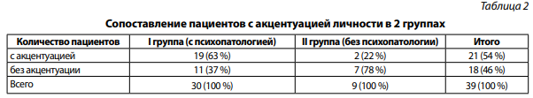 При наличии заострения личностных черт расстройства психики при КНТН возникали значительно чаще (66%), чем у пациентов с гармоничным складом психики (табл. 2).
