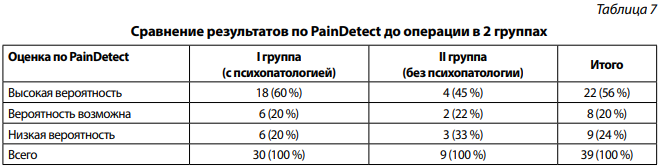 В 24% случаев болевой синдром может иметь психогенный характер, при условии отсутствия соматогенной боли. Другими словами, в формировании болевого синдрома помимо нейроваскулярного конфликта имели значение и психические реакции пациентов (возможности и способности психической адаптации пациентов к заболеванию). Данные обработки представлены в табл. 7.