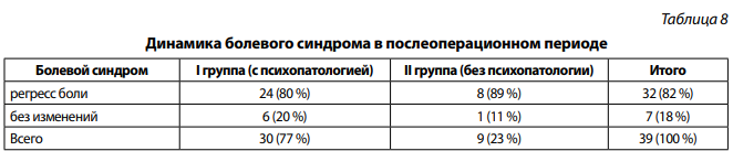 При клиническом обследовании из 39 пациентов с хроническим болевым синдромом, обусловленным невралгией тройничного нерва, в раннем послеоперационном периоде его регресс отмечался у 82% (32 человека). Причем в группе пациентов с психическими нарушениями — у 80 % (24 человека), а в группе без расстройств психики — у 89% (8 человек). У 18% (7 человек) динамики (регресса) болевого синдрома не отмечалось, либо они затруднялись оценить свое состояние (табл. 8).