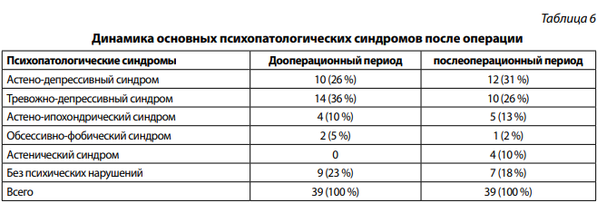 Психические нарушения различной степени выраженности перед оперативным лечением были выявлены у 77% пациентов. 47% пациентов с психическими нарушениями получали психофармакологическое лечение (антидепрессанты, транквилизаторы, ноотропы с седативным компонентом и их комбинации).