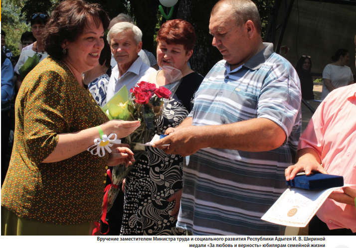 2-й ведущий: Мы продолжаем чествовать семьиюбиляры нашей Республики. Награждение проводит заместитель министра труда и социального развития Республики Адыгея Ирина Викторовна Ширина.