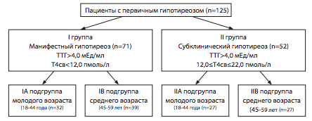 Было обследовано 125 женщин в возрасте от 18 до 59 лет, страдающих первичным гипотиреозом (ТТГ > 4,0 мМЕд/мл). Гипотиреоз являлся манифестным при низком уровне свТ4 (свободного тироксина) < 12,0 пмоль/л, субклиническим – при нормальном значении свТ4 (12,0 – 22,0 ммоль/л). Уровень ТТГ находился в пределах от 4,26 до 27,71 мМЕд/ мл, ат ТПО – от 0 до 4189,7 Ед/л.