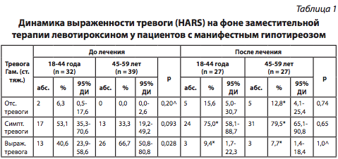 Цель – изучить распространенность и степень выраженности тревоги у пациентов с гипотиреозом в зависимости от возраста и уровня компенсации гипотиреоза.