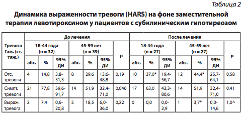 Статистический анализ выявил, что достоверные различия в степени выраженности тревоги у пациентов с СГ и МГ сохраняются только в подгруппах лиц среднего возраста (выраженность тревоги выше при субклиническом гипотиреозе, р < 0,05) (табл. 2).