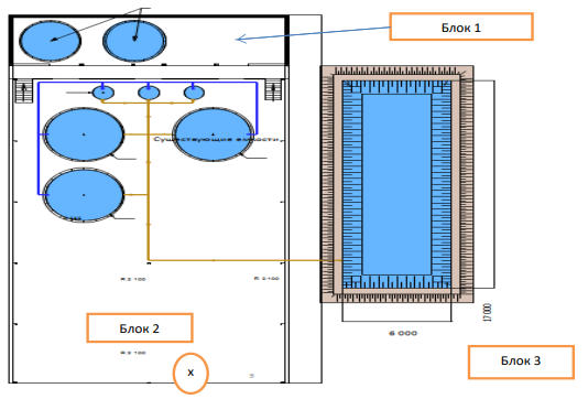 Для строительства рыбоводного хозяйства разведения в первую очередь необходимо было найти источник воды. Для этого была построена скважина (Х) глубиной 150 м. Хозяйство состоит из трех блоков (см. рис.).