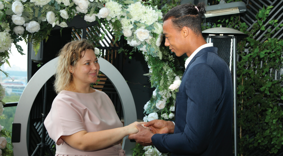 Молодые познакомились, как это бывает в настоящее время, в социальных сетях. Алена любезно согласилась показать Махди Москву, а теперь на фоне панорамы города они зарегистрировали свой брак.