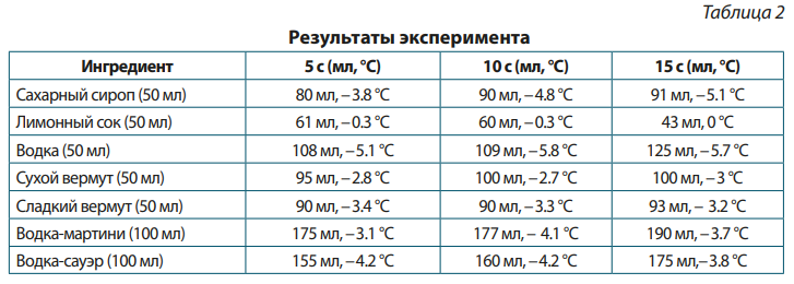 1. Спиртосодержащие смеси (водка, водка-мартини, водка-сауэр) продемонстрировали самую высокую степень разбавления и значительное падение температуры. Уже на пятой секунде объём спиртовой фракции возрастал в среднем на 60– 70 %, а к 15-й секунде мог превышать исходные 50 мл в 2–2,5 раза. Подобный эффект объясняется тем, что спирт быстро «вбирает» воду, формируя более крупную гидратную оболочку вокруг спиртовых молекул, что даёт значительное изменение объёма и понижение температуры.