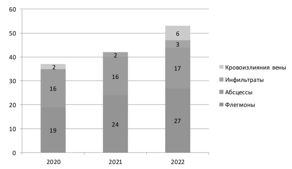 Сравнивая показатели 2020–2022 гг., можно отметить рост как общего числа осложнений, так и прирост каждого вида осложнений (рис. 1). Количество флегмон в 2022 году увеличилось на 3 случая и составило 27 случаев, абсцессы и инфильтраты увеличились на 1 случай и составили 17 и 3 случая соответственно. Кровоизлияния из вены увеличились на 6 случаев. Причиной данного прироста может быть ухудшение эмоционального состояния медицинских сестер, связанного с пандемией коронавируса, несоблюдение мер дезинфекции и антисептики.