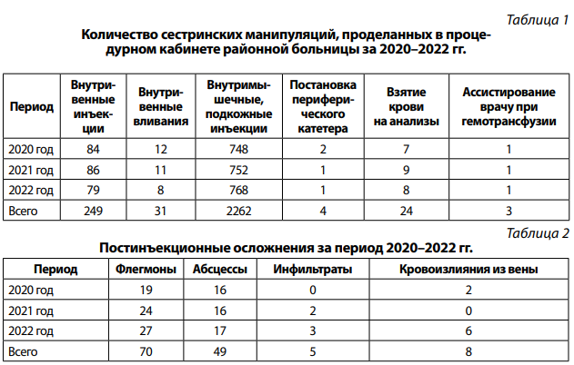 Общее число постинъекционных осложнений процедурного кабинета дневного стационара ГКП на ПХВ «Таскалинская РБ» за 2020–2022 гг. составило 132 случая, что составляет 5 % от общего числа процедур за 2020–2022 гг. (2573 инъекций):