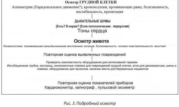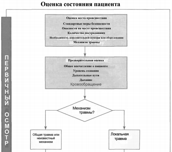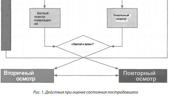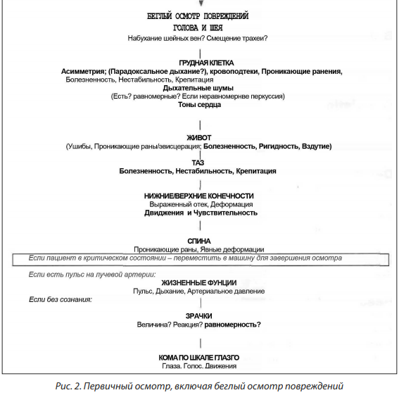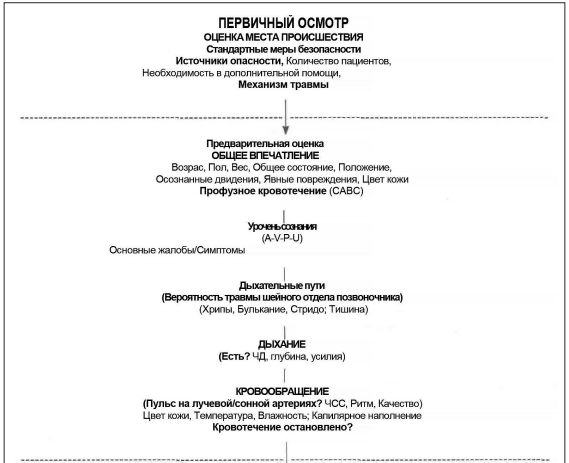 Если уметь задавать правильные вопросы, можно быстро получить необходимую информацию для выстраивания грамотной тактики лечения пациента. Нижеследующая информация представляет собой последовательность вопросов, которые необходимо задать себе при выполнении первичного осмотра, в рамках курса ITLS. Это необходимый минимум, который понадобится при выполнении каждого из этапов первичного осмотра (рис. 1).