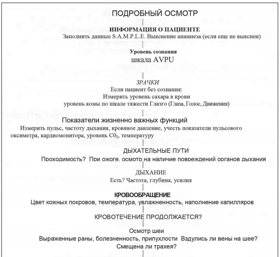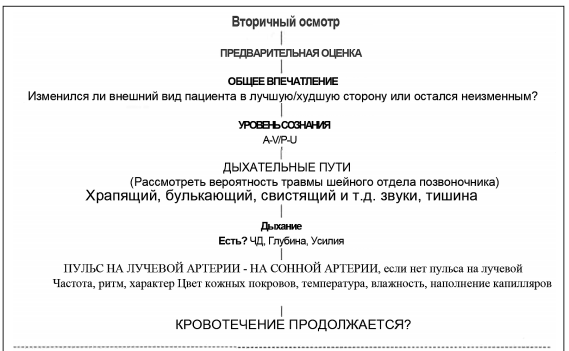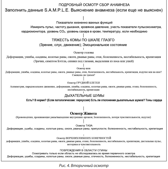 По общему правилу, нужно быстро повторить алгоритм предварительной оценки, прежде чем начать вторичный осмотр. Это можно сделать, пока ваш напарник проверяет показатели жизненно важных функций. Если уметь задавать правильные вопросы, можно быстро получить необходимую информацию для выстраивания грамотной тактики лечения пациента. Нижеследующая информация представляет собой последовательность вопросов, которые необходимо задать себе при выполнении вторичного осмотра. Это необходимый минимум, который понадобится при выполнении каждого из этапов осмотра (рис. 4).