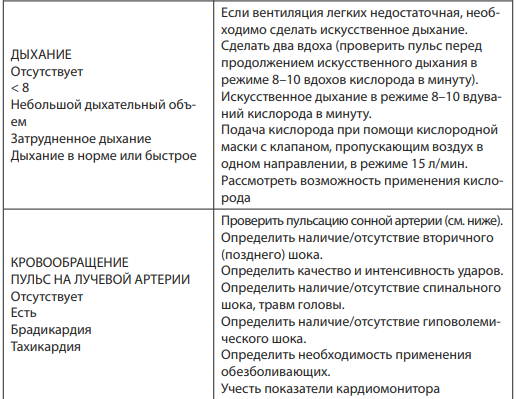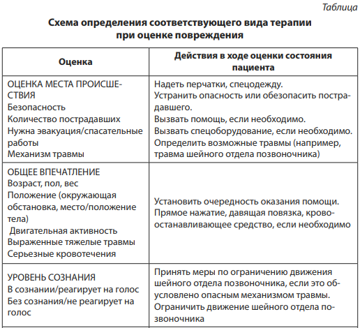 На занятиях по курсу ITLS используются краткие сценарии возможного развития событий и манекен в качестве модели пациента. Обучающихся делят на две группы для отработки навыков проведения первичного осмотра, оказания неотложной помощи и мгновенного вынесения решений, касающихся транспортировки пациента. Каждый из участников должен исполнять роль руководителя группы как минимум один раз. Особо важная информация представляет собой ответы на вопросы, которые должен задавать себе обучаемый на каждом из этапов осмотра. Схема определения соответствующего вида терапии (табл. 1) представляет собой действия, которые необходимо предпринять (лично или путем делегирования) в соответствии с оценкой состояния.