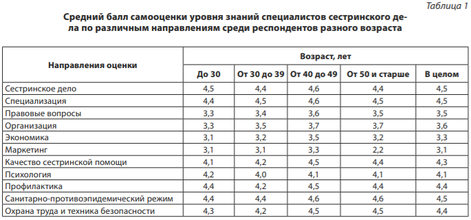 Следующий блок вопросов анкеты был посвящен самооценке уровня их знаний в различных аспектах, связанных с сестринской деятельностью. Как видно из таблицы 1, примерно на уровне 4,5 баллов они оценили свою подготовленность, связанную с ежедневно выполняемыми функциями: сестринское дело (включая его специфику с учетом места работы), вопросы профилактики, соблюдение санитарнопротивоэпидемического режима, охраны труда и техники безопасности. Несколько ниже (4,3) была оценка знаний в области обеспечения качества сестринской и психологической помощи. Существенно ниже был уровень подготовки сестринского персонала в вопросах, связанных с организацией (и их труда, и работы учреждений в целом), включая: организацию (3,6) и экономику здравоохранения (3,3); правовые вопросы (3,5), маркетинг и менеджмент (минимальный балл — 3,1). Практически по всем оцениваемым аспектам наиболее высокими были самооценки уровня знаний среди респондентов 40–49 лет (таблица 1).