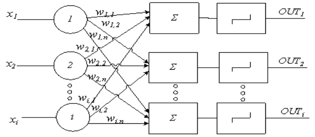 Эти системы (и подобные им) получили название персептронов и состояли в основном из одного слоя искусственных нейронов, соединенных с помощью весовых коэффициентов с множеством входов, что видно на рисунке 2.