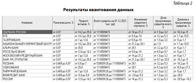 Так, например, в группу крупнейших банков с рыночной долей от 0,97 вошли следующие, имеющие максимальную долю — % на рынке кредитов и соответствующий уровень просроченных кредитов (%): Сбербанк России — 23,5 (2,8 %), ВТБ — 10,5 (3,4), Газпромбанк — 4,8 (2,5), Национальный клиринговый центр — 1,7 (0,04), Альфа-банк — 3,2 (4,1), Россельхозбанк — 2,6 (7,1), Московский кредитный банк — 2,2 (2,6), Банк ФК Открытие — 1,8 (9,7), Росбанк — 0,8 (3,2 %).