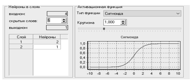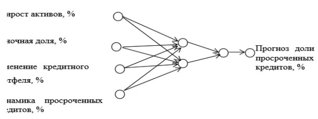 На входном слое персептрона имеется четыре параметра (%): прирост активов, рыночная доля, изменение кредитного портфеля, динамика просроченных кредитов. На выходном слое имеется один параметр — прогноз доли просроченных кредитов (%). Архитектура нейросети помимо входного имеет два скрытых слоя и выходной слой с единственным параметром (рис. 6).
