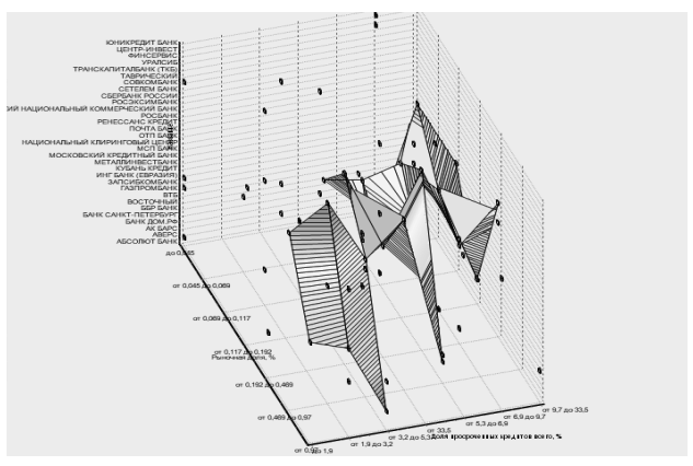 Рис. 3. Гистограмма распределения коммерческих банков по рыночной доле и доле просроченных кредитов