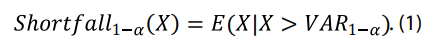 Следует отметить, что важно задействовать и другие показатели меры риска, определенные преимущества которых можно использовать в качестве дополнения к развитию рассматриваемого в качестве основного метода оценки риска VaR. Среди них выделяется такой показатель, как Shortfall, причем результаты оценки которого более консервативны, что просматривается в том, что для того же уровня риска требуется резервировать больший объем капитала по сравнению с VaR. Важной чертой рассматриваемого показателя является то, что он позволяет учесть потери, которые могут наступить с очень малой долей вероятности. Другими словами, оценить риск в том случае, если распределение потерь имеет характерный тяжелый «хвост», например, в случае операционного риска. Shortfall можно представить как математическое ожидание потерь, превысивших по величине значение VaR, т. е.: