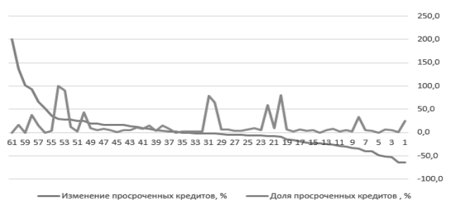 Как свидетельствуют данные диаграммы, в процессе сокращения просроченных кредитов их доля в кредитном портфеле не снижается таким образом, что можно было бы говорить о кокой-то зависимости. Более того, в средней части графика можно наблюдать всплески приростов просроченной задолженности по кредитам, в отдельных проблемных банках, например ТКС банк (Тинькофф. Кредитные системы), — 100 %, БМ-банк — 90, Инвестторгбанк 80,6 %, что объясняется действием других неучтенных факторов, в том числе привлечение «плохих» клиентов с реструктурированной задолженностью из других банков.