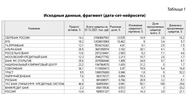 Разработана программа Perseptron для прогноза динамики доли просроченных кредитов в портфеле коммерческого банка, которая сформирована на платформе Deductor. Исходные данные для прогноза динамики прибыли AI-системой представлены в таблице 1.