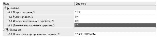 Сформированная AI-модель позволяет получить прогнозное значение величины просроченных кредитов под действием факторов. Подставим в AI-модель значения параметров, например, для банка Почта-банк на конец 2021 г., а именно: прирост активов 11,3 %, рыночная доля — 0,4, изменение кредитного портфеля — 0,5, динамика просроченных кредитов 27 %, и получим прогноз доли просроченных кредитов 12,43 %.