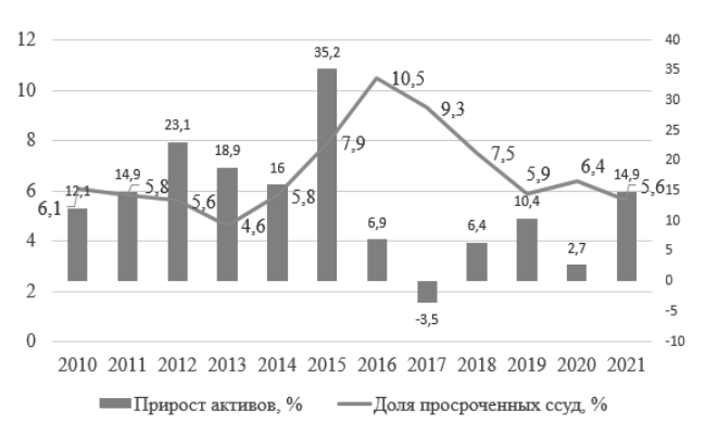 Рис. 1. Динамика активов и доли просроченных ссуд в 2010–2021гг.