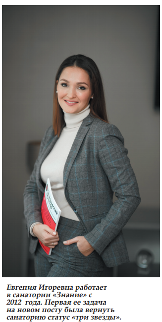 ВСЕ ЭТО СТАЛО ВОЗМОЖНЫМ БЛАГОДАРЯ СМЕНЕ УПРАВЛЕНИЯ И НОВОМУ ВЕКТОРУ В РАЗВИТИИ САНАТОРИЯ. О ТОМ, КАК ЗА 8 ЛЕТ ПРЕВРАТИТЬ ПАНСИОНАТ В ВЫСОКОРЕНТАБЕЛЬНЫЙ САНАТОРИЙ, РАССКАЗАЛА ЕВГЕНИЯ ИГОРЕВНА ДВОРЯНИНОВА, ИСПОЛНИТЕЛЬНЫЙ ДИРЕКТОР САНАТОРНО-КУРОРТНОГО КОМПЛЕКСА «ЗНАНИЕ».
