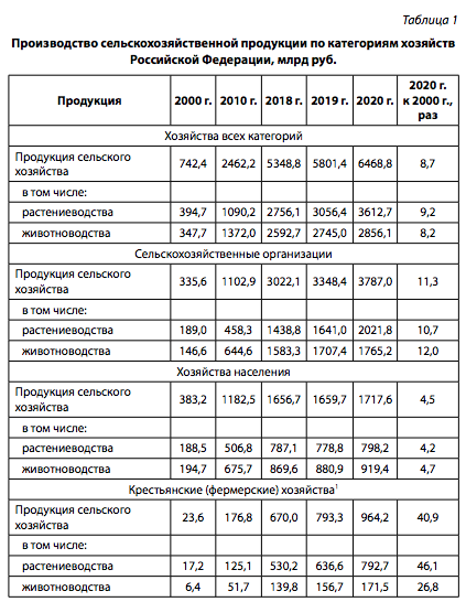 Исходя из цели исследования (оценка состояния и динамики развития сельского хозяйства в Российской Федерации), в работе предпринят скрупулезный анализ имеющейся в Росстате статистической информации по условиям и результатам сельскохозяйственной деятельности в отраслях растениеводства и животноводства в период с 2000 г. и по настоящее время (последние данные 2020 г.) [3]. В процессе обобщения полученных результатов используются опубликованные в научных журналах прогнозы российских и зарубежных ученых относительно перспектив развития аграрной отрасли экономики в условиях современных вызовов и угроз, а также их мнения по вопросам формирования и развития релевантного состоянию отрасли человеческого капитала [4, 5].