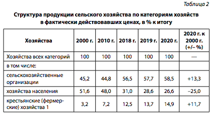 Если обратиться к относительным показателям, в частности к структуре продукции сельского хозяйства по категориям хозяйств в фактически действовавших ценах (табл. 2), то за временной отрезок с 2000 г. сельскохозяйственным организациям удается постоянно наращивать долю в производстве сельскохозяйственной продукции, увеличив ее с 45,2 % в 2000 г. до 58,5 % в 2020 г. (на 13,3 %). Такая же перманентно положительная динамика присуща крестьянским (фермерским) хозяйствам (увеличение доли производства на 11,7 %, с 3,2 % в 2000 г. до 14,9 % в 2020 г.), в то время как доля хозяйств населения сократилась на 25 % (с 51,6 до 26,6 % за анализируемый период), что, по сути, означает позитивные изменения и на селе (сельское население восстанавливает занятость в сельскохозяйственных организациях и других формах хозяйств), и в сельскохозяйственной отрасли производства (укрепляются фермерские хозяйства, развивают свой бизнес сельскохозяйственные организации).