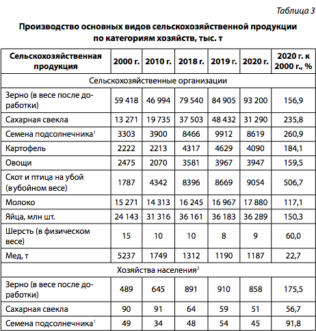 Перейдя к натуральным показателям и состоянию производства продукции в разрезе конкретных его видов (табл. 3), можно отметить, что в кластере «сельскохозяйственные организации» самый большой рост производства от уровня 2000 г. наблюдается в группе продукции «скот и птица на убой» (506,7 %, или более чем в 5 раз), все другие виды продукции по мере убывания степени роста производства можно ранжировать следующим образом: семена подсолнечника (260,9 %); сахарная свекла (235,8); картофель (184,1); овощи (159,5); зерно (156,9); яйца (150,3); молоко (117,1 %). В то же время существенное сокращение наблюдается по таким специфическим видам продукции, как шерсть (60,0 %) и мед (22,7 %). В следующей группе сельхозтоваропроизводителей — «хозяйства населения» по шерсти и меду наблюдается либо стабилизация (по шерсти производство зафиксировалось на уровне 2000 г. и составило относительно его 100 %), либо небольшое увеличение (по меду — 130,6 %). Кроме этих видов продукции, позитивная динамика сохраняется лишь в производстве зерна (175,5 %), в то время как по всем остальным видам сельскохозяйственной продукции в хозяйствах населения отмечается сокращение результатов, которые по степени ухудшения ситуации выстаиваются в следующем порядке: семена подсолнечника (91,8 %); овощи (85,9); яйца (82,3); скот и птица на убой (70,5); молоко (70,0); сахарная свекла (56,9); картофель (47,6 %). И наконец, как это следовало уже из предыдущего анализа, рост производства по всем видам продукции присущ крестьянским (фермерским) хозяйствам, в которых, например, за период с 2000 по 2020 г. по группе «овощи» производство увеличилось в 11 раз, по группе «шерсть» — в 10 раз. Увеличение по всем оставшимся (отражающимся в статистике) видам сельхозпродукции (по мере убывания) распределяется таким образом: семена подсолнечника (820,1 %); картофель (725,6); зерно (714,8); молоко (501,1); скот и птица на убой (438,8); яйца (394,3); сахарная свекла (373,0 %).