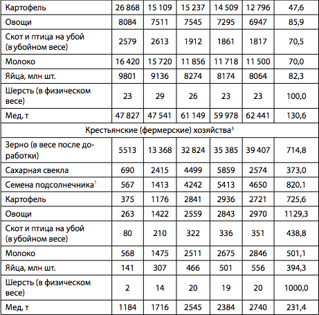 Источник: составлено по данным сборника Росстата [3]. 1 - С 2018 г. — в весе после доработки; 2000, 2010 гг. — в первоначально оприходованном весе. 2 - На основании данных выборочного обследования личных подсобных и других индивидуальных хозяйств граждан. 3 - Включая индивидуальных предпринимателей; на основании данных выборочного обследования крестьянских (фермерских) хозяйств и индивидуальных предпринимателей.