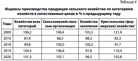 В силу сохранения тесной зависимости сельскохозяйственного производства от погодных условий (климата) динамика его показателей отличается от года к году (табл. 4). Даже в течение последних трех лет 2019 г., к примеру, оказывается наиболее удачным для сельскохозяйственных организаций (индекс производства 106,6 %) и крестьянских (фермерских) хозяйств (110,4 %), хозяйства населения при этом продолжают вырождаться (индекс равен 97,8 %), а 2020 г. демонстрирует рост, но уже меньший, чем в предыдущем году (сельскохозяйственные организации — 103,1 %, крестьянские (фермерские) хозяйства — 103,8, хозяйства населения — 96,5 %).
