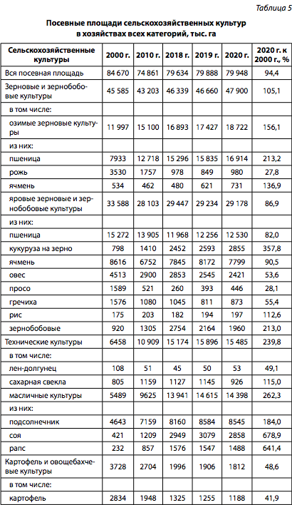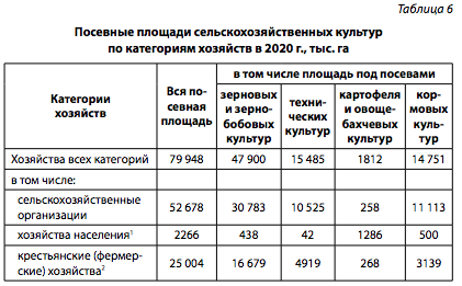 Несмотря на всевозможные усилия к возвращению в оборот земельных площадей, заброшенных и переданных в несельскохозяйственное использование в 1990-е — начале 2000-х гг., только с 2010 г. общая посевная площадь в Российской Федерации начинает постепенно увеличиваться (за последние 10 лет наблюдается рост с 74 861 тыс. до 79 948 тыс. га, на 6,8 %). Однако если оценивать состояние данного показателя в 2020 г., то на последнюю отчетную дату он достиг лишь 94,4 % относительно точки отсчета (2000 г.). Рост посевных площадей фиксируется по группе «технические культуры» (239,8 %) и особенно по таким культурам, как соя (678,9 %) и рапс (641,4 %). Не менее значимое, но уже сокращение происходит с посевными площадями под картофелем и овощебахчевыми культурами (48,6 %), а также под кормовыми культурами (51,0 %). В разрезе категорий хозяйств (табл. 6) в 2020г. структура посевных площадей такова, что в общей посевной площади преобладают, безусловно, сельскохозяйственные организации (66 %), в два раза меньше занимают крестьянские (фермерские) хозяйства (31 %), и совсем незначительная доля принадлежит хозяйствам населения (2,8 %). Примерно такие же пропорции свойственны структуре площадей под посевами зерновых и зернобобовых, технических, кормовых культур. Исключение при этом составляют лишь посевные площади под картофелем и овощебахчевыми культурами, в которых большая часть занята хозяйствами населения (71,0 %), а сельскохозяйственные организации и крестьянские (фермерские) хозяйства делят оставшуюся (под этими культурами) площадь практически поровну (соответственно 14,2 и 14,8 %).