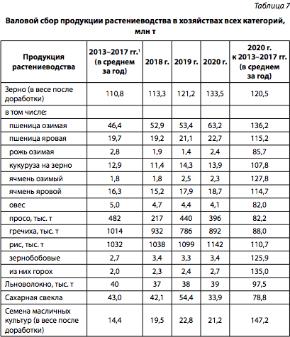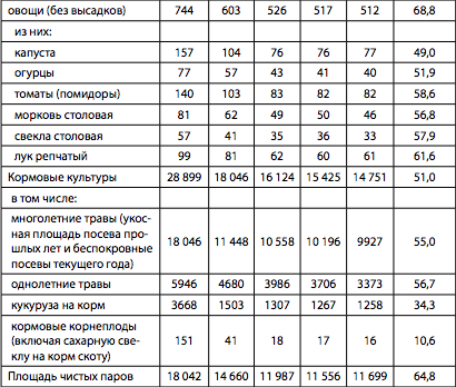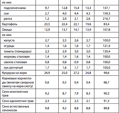 Благодаря тому что аграрная отрасль экономики, как и другие ее отрасли, развивается на основе современных технологий (и других интенсивных факторов), валовой сбор по многим видам растениеводческой продукции растет быстрее, чем выделенные для соответствующего производства посевные площади (табл. 7). Положительные тенденции наблюдаются в производстве зерна (пшеница, ячмень, зернобобовые), семян масличных культур (подсолнечник, соя, рапс), овощей (огурцы, томаты). По многим другим видам продукции растениеводства отмечается, как правило, небольшое, но снижение валового сбора: зерновые — рожь, овес, просо, гречиха; льноволокно и сахарная свекла; картофель; кукуруза на корм; кормовые корнеплоды; сено одно- и многолетних трав, естественных сенокосов (по всем из них снижение за анализируемый период примерно на 10–20 %).