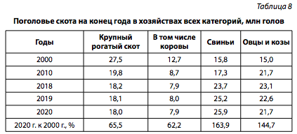 Как известно, животноводческая отрасль пострадала от реформ 1990-х гг. гораздо более существенно, чем растениеводство. Несмотря на колоссальные усилия государства (многие программы поддержки направлены на ускоренное развитие именно животноводческой отрасли), существенно сократилось поголовье крупного рогатого скота (в 2020 г. оно насчитывало лишь 65,5 % относительно 2000 г.), еще в большей степени сокращение коснулось поголовья коров (62,2 % от уровня 2000 г.), в то время как поголовье свиней возросло в 1,6 раза, а овец и коз — в 1,4 раза (табл. 8).