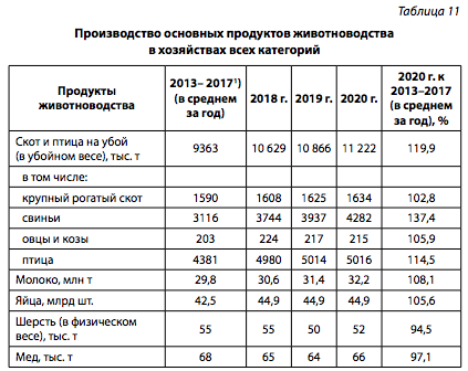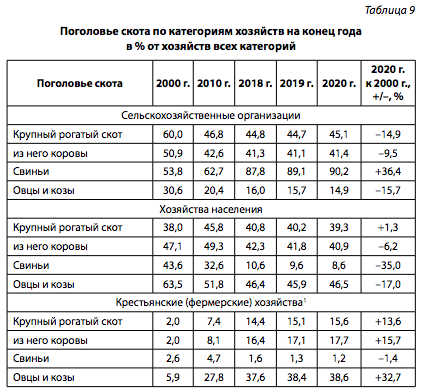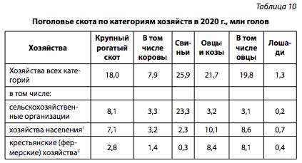 В результате в 2020 г. из 18 млн голов крупного рогатого скота 8,1 млн голов содержится в сельскохозяйственных организациях, 7,1 млн голов — в хозяйствах населения, существенно меньше (2,8 млн голов) — в крестьянских (фермерских) хозяйствах (табл. 10). Примерно в таких же пропорциях распределяется между данными категориями хозяйств поголовье коров (общее — 7,9 млн голов). Практически все поголовье свиней (общее поголовье 25,9 млн голов) находится в сельскохозяйственных организациях (90 %), овцы и козы примерно в равных долях распределяются между хозяйствами населения и крестьянскими (фермерскими) хозяйствами (общее поголовье 21,7 млн голов), половина поголовья лошадей выращивается в хозяйствах населения (общее поголовье 1,3 млн голов).